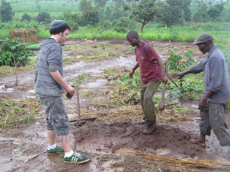 Not to be left out, Neveson grabbed a hoe and dug the hole and then Ryan planted the tree with Dennis looking on. All three were soaked by the time they were done but in good Malawian style they had fun with smiles on their faces.